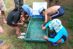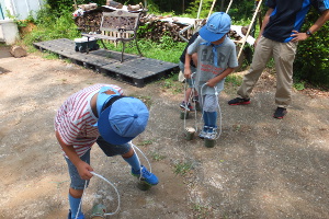 初日の午前は「竹ぽっくり」を作って遊びました。午後は購入したドジョウで「ドジョウ掴み」⇒最初は「触れな