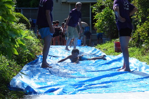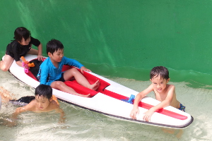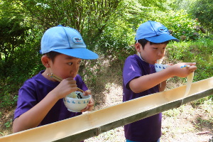 トと指導者が作ってくれた全長20メートルの流しそうめん台でそうめんを食べました。その後、ウォータースライ