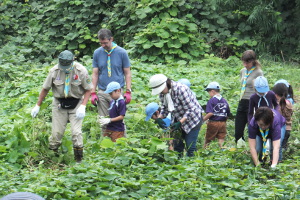 ビーバー隊は今年二回目の草取りをしました。今回はカブ隊とボーイ隊も一緒です。 三週間前に指導者たちが草取りをしてくれていたので、アッという間に草取りは終了しました。