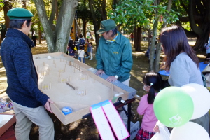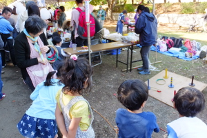 グボード・丸太を切ってペンダント作り・輪投げ・びっくりコップ作り等の体験コーナーを出店しました。