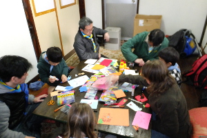 本部(青黄館)において、クリスマスカードを作りました。 12月20日(日)に予定されているクリスマス会でのプレゼントに添えるカードです。 スカウトたちは絵を描いたり、折り紙を貼ったりして、手作りカードが出来ました。