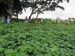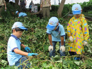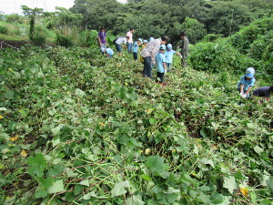 集合前、雨が降ったり止んだり。本日、予定していた活動(芋畑の草取り)を行うか、別の活動にするか悩みました が、とりあえず、芋畑に行くことにしました。芋畑に近づくにつれ、青空に。 休憩を挟みながら、約1時間、草取りをしました。