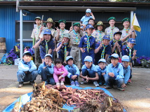 収穫したさつま芋と里芋を前に記念写真