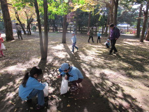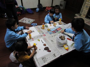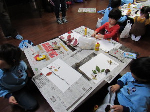 本部にて、工作(落ち葉アート)をしました。 はじめに、總持寺境内で落ち葉や小枝、どんぐりや松ぼっくりなどを拾い集め、本部に戻り、制作開始。 みんなが次から次へと画用紙に貼って、無事、時間内に完成することが出来ました。