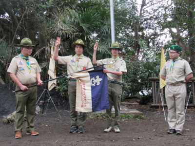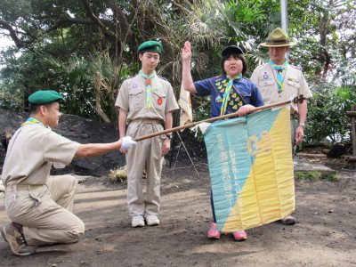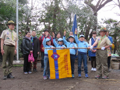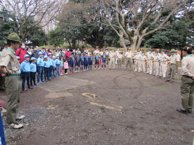 本部前広場において上進式を行いました。 今年の上進スカウトはビーバー隊からカブ隊へ4名、カブ隊から ボーイ隊へ1名、ボーイ隊からベンチャー隊へ2名の計7名が上 進し、それぞれ上進した隊の「やくそく」と「さだめ」、「ちか い」と「おきて」を元気よく、言いました。