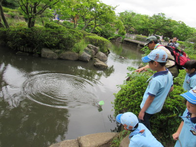 公園に着くなり、まずは、池に仕掛け(水中生物捕獲)をし、そ