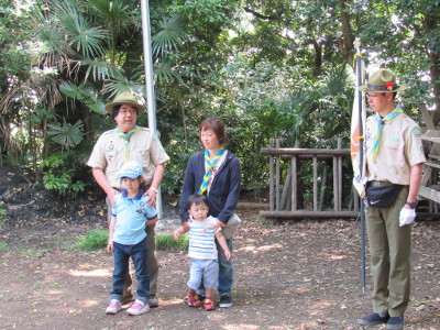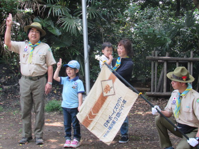 本部前広場において、ビーバー隊入隊式を行いました。 今年度に入り、二人目の仲間ができました。これによりビーバー スカウトは6人になりました。