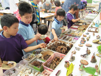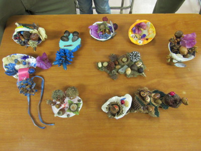 貝を土台にして木の実や花びらを飾り付けしました。公園を出る