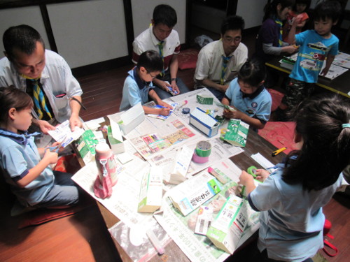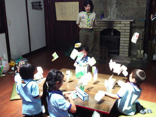 本部(青黄館)において基本動作と工作をしました。 基本動作では服装点検報告や集合体形などを確認した後、ビーバ ー歌集から数曲をみんなで歌いました。 工作では紙パックでビックリ箱を作り、スカウトたちは楽しく遊 びました。