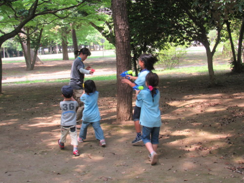 夏休みに入って最初の活動は水鉄砲を使っての水遊び。 2チームに分かれての対戦ゲームやポイを使っての的当て。そし て最後はトイレットペーパーにぶら下がっているお菓子を落とし ゲットするゲームをしました。 スカウトたちは猛暑の中、暑さを忘れて、水遊びに夢中でした。