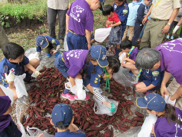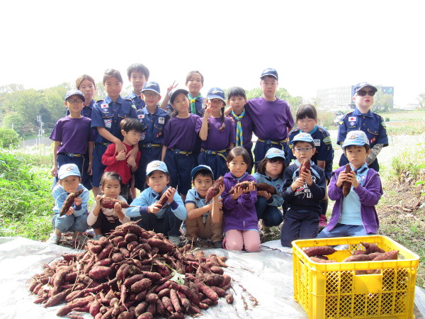 今年もビーバー隊・カブ隊を中心に芋掘りを行いました。 収穫量は昨年より少なかったが、スカウトたちは元気に たくさんのお芋を掘りました。 お土産として一人3個ずつ持ち帰り。残りのお芋は11月 17日に予定している収穫祭にて焼き芋やお芋料理にして みんなで食べます。