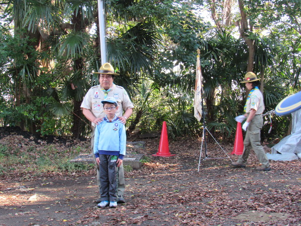 本部前広場において、ビーバー隊入隊式を行いました。 大きな声で元気よく「やくそく」と「きまり」を言いました。 これにより、ビーバースカウトは8人です。