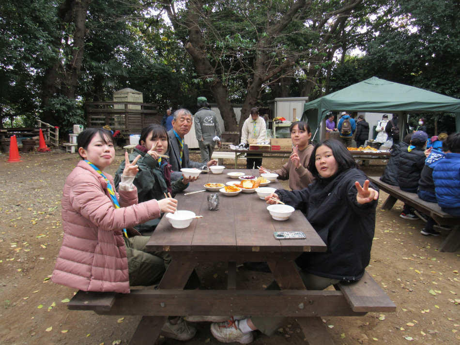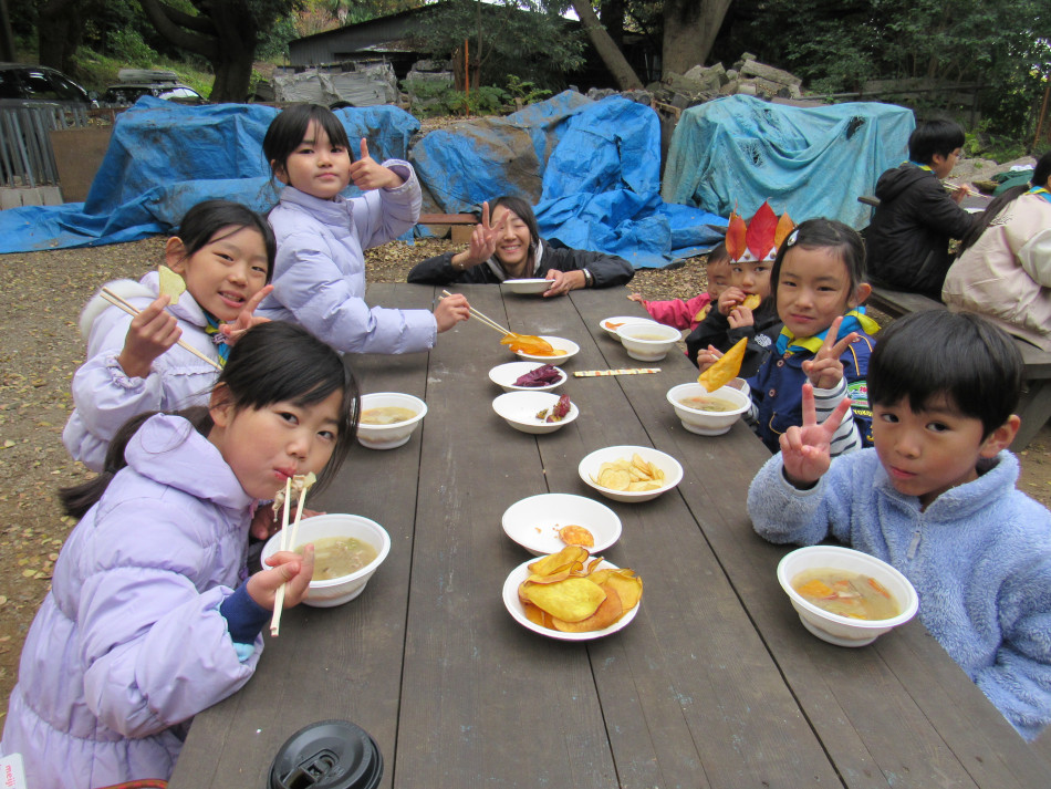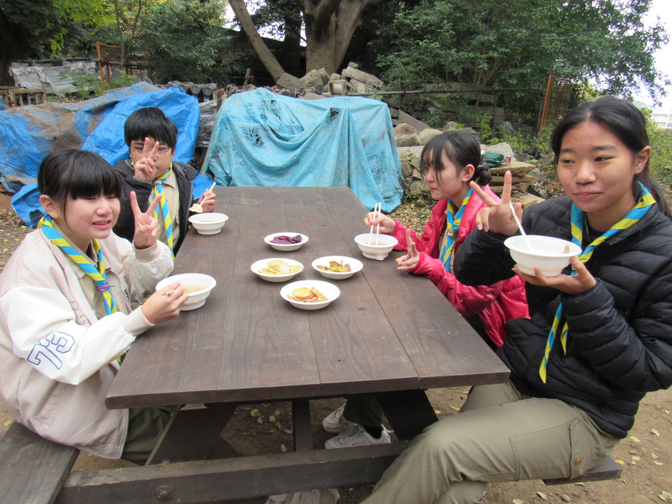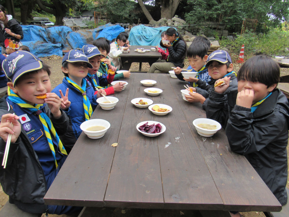 スカウト広場に約50名が集まり、収穫祭(焼き芋会)を開催し ました。 今年は各種チップス、天ぷら、大学芋、焼き芋、サツマイモ汁が 卓を飾りました。