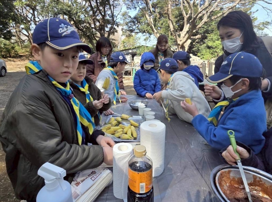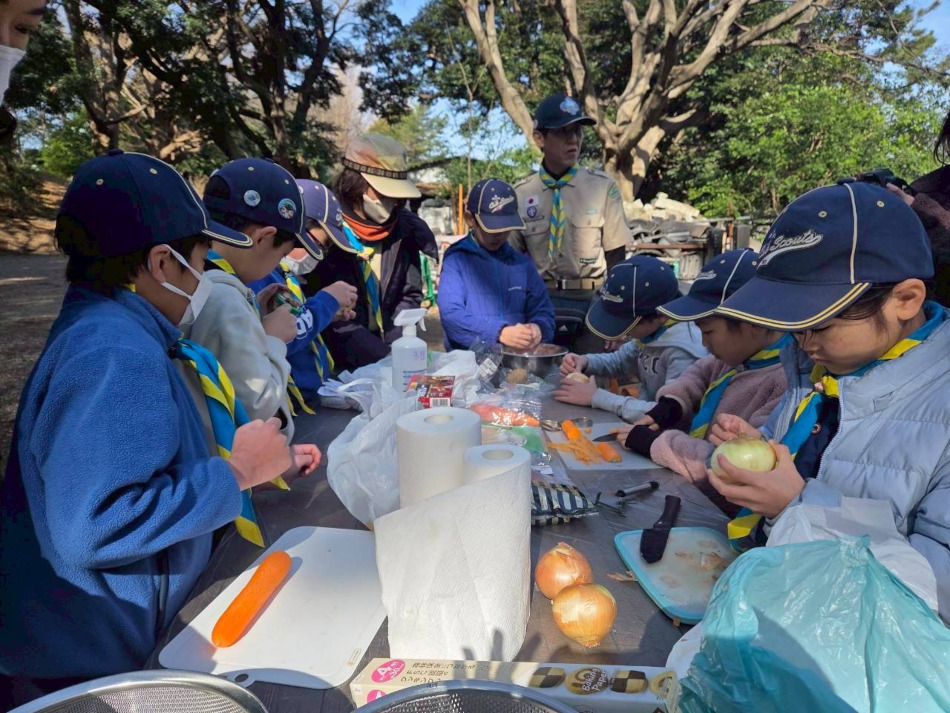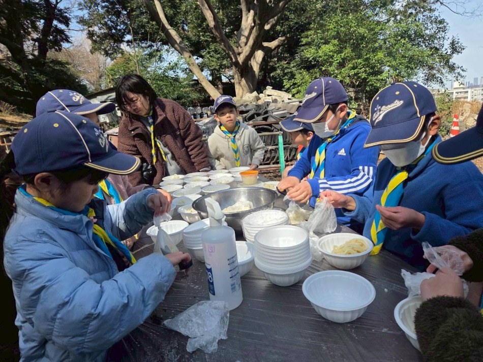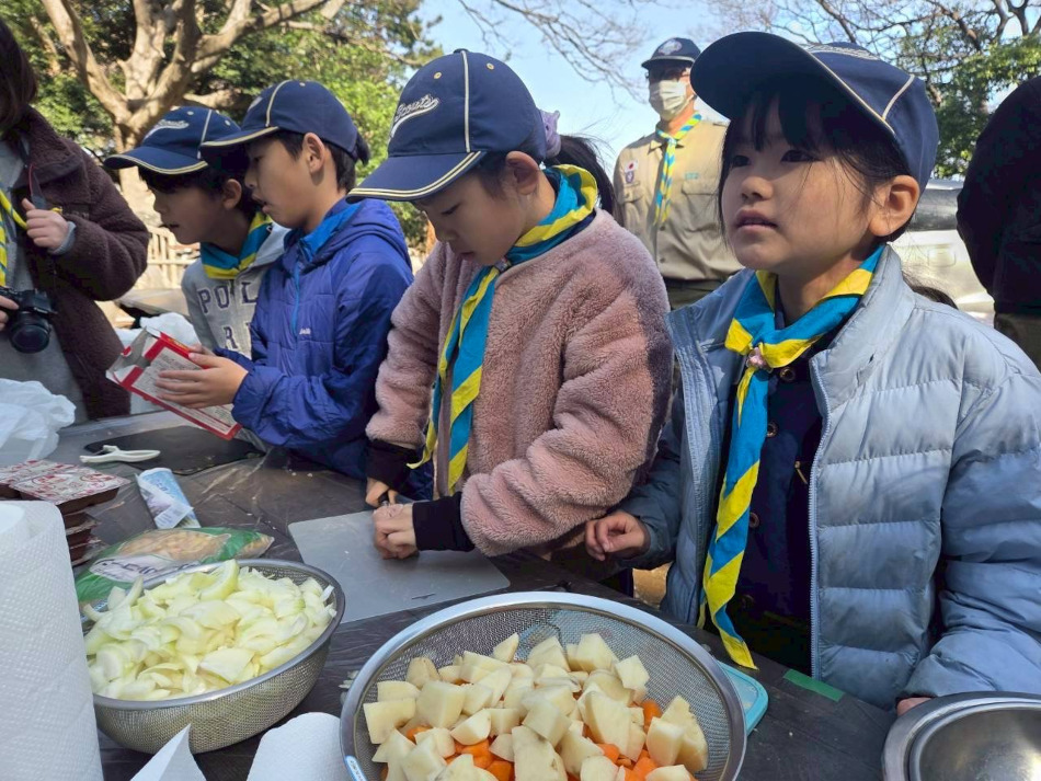 スカウト広場において、4月に上進するスカウト2名のお別れ会 を行いました。 今回はしかスカウト、うさぎスカウトが上進スカウトにカレーう どんを作りました。