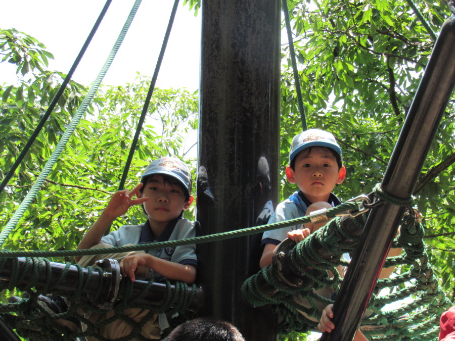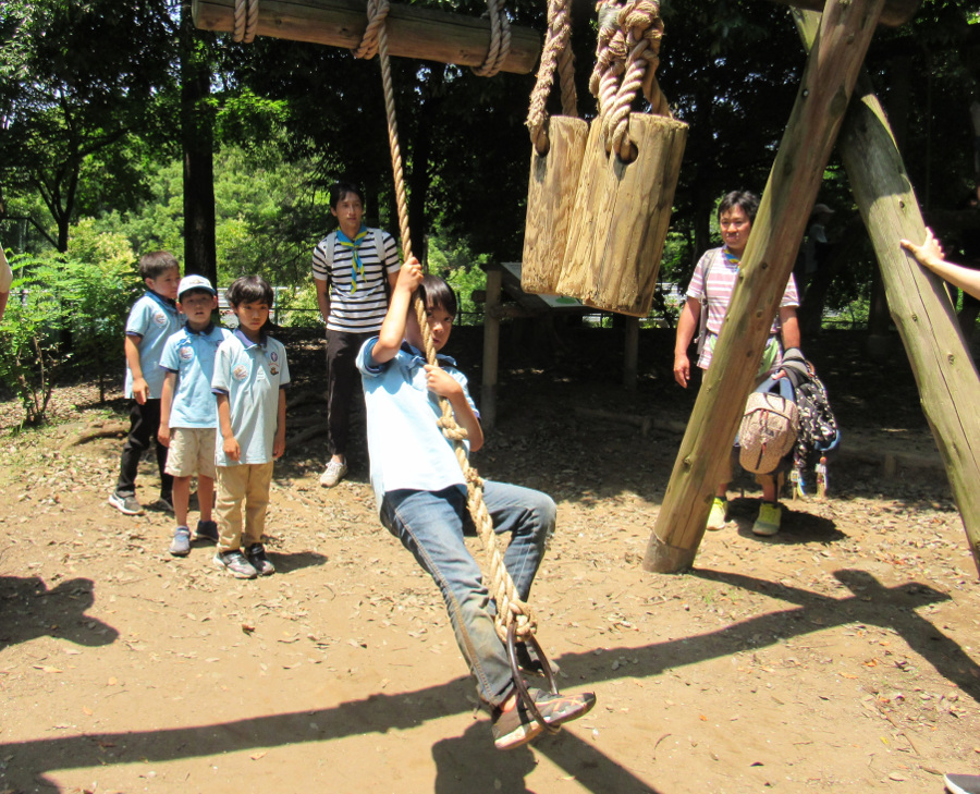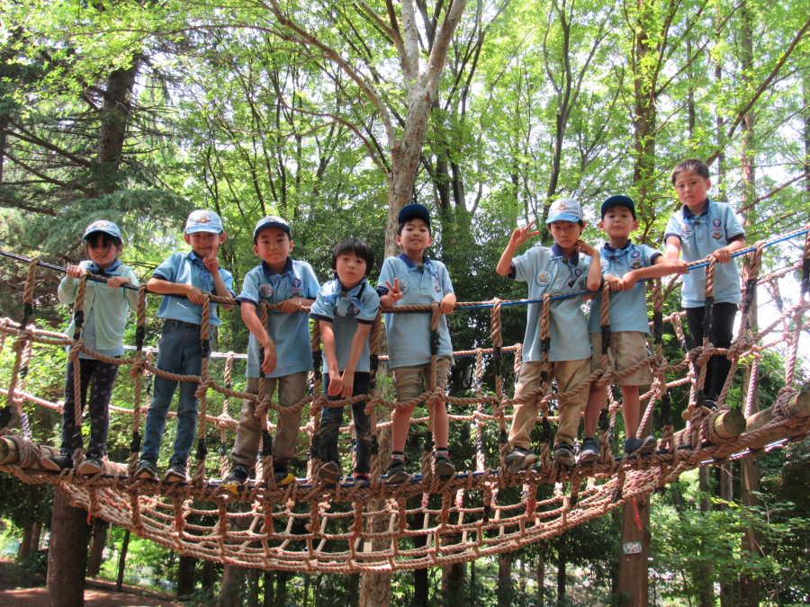 スカウトたちは次々とアスレチックをクリアする中、隊長が楽し