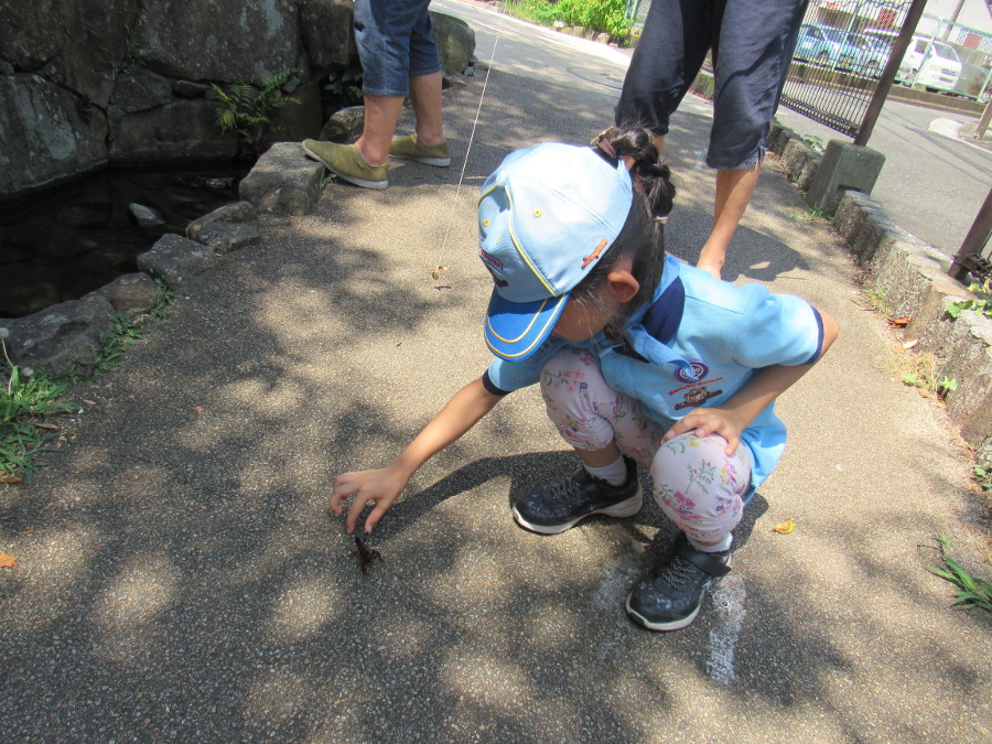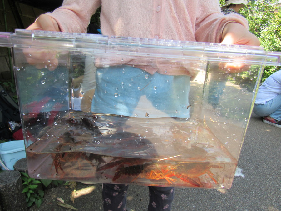 ザリガニを見つけると、糸を垂らし、数秒で釣り上げるスカウトが