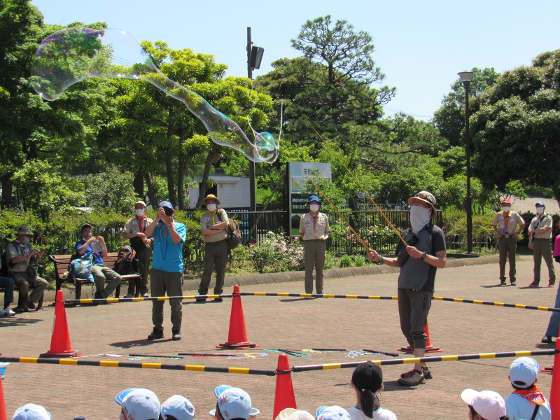 ース体験と「シャボン玉オヤジ」さんのパフォーマンスを見学し