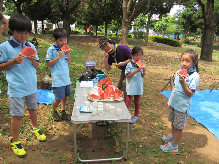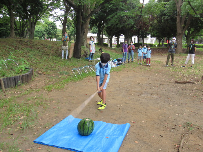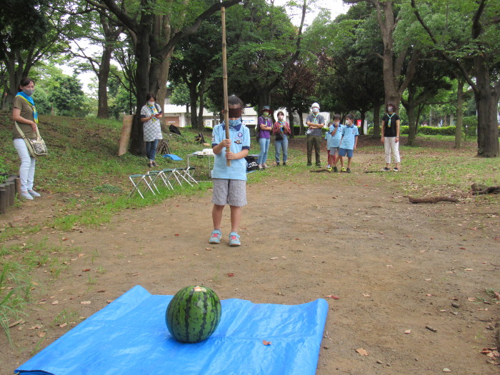 後半はスカウト、保護者、リーダーによるスイカ割りと種飛ば