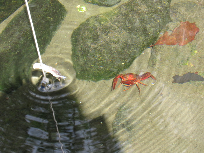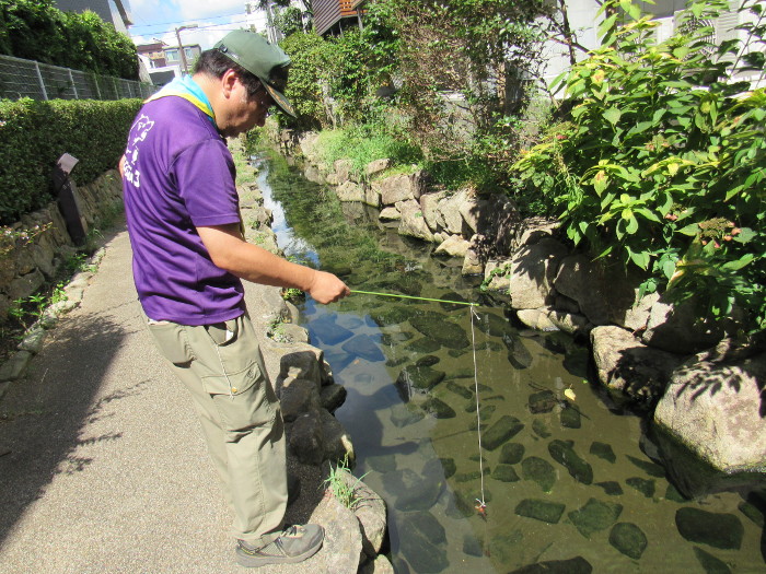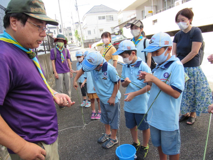 スカウトたちは暑さを忘れ、ザリガニ釣りに夢中でした。