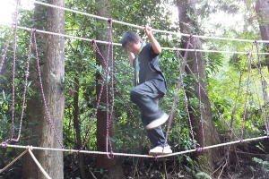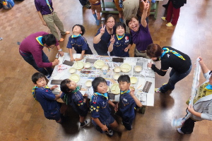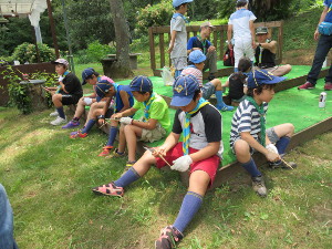二日目はボーイ隊と指導者で作ってくれたモンキーブリッジを渡ったり、夕食会の準備としてカブ隊は芋餅などを作