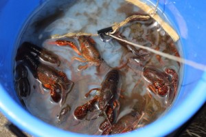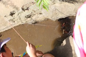草取り後は近くの小川でたくさんのザリガニを釣りました。