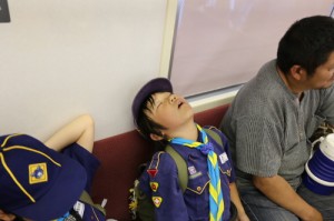 疲れて帰りの電車で熟睡するスカウトもいました。