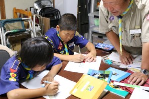 本部にて国旗のたたみ方を練習したり、カブブックに記載されている「日本の国旗」や「世界の国々」を学び、