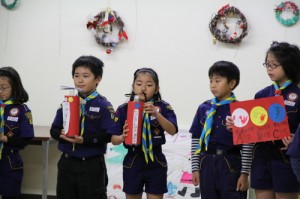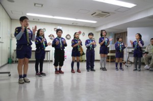 今年のカブ隊スタンツは「小さなレスキュー隊!本部で活動中」と「ボディパーカッション」を行いました。