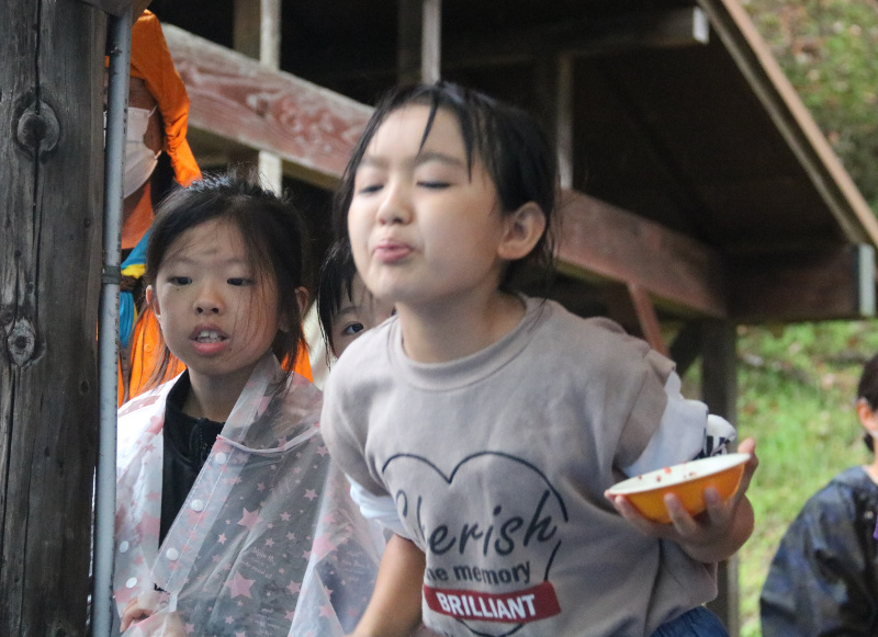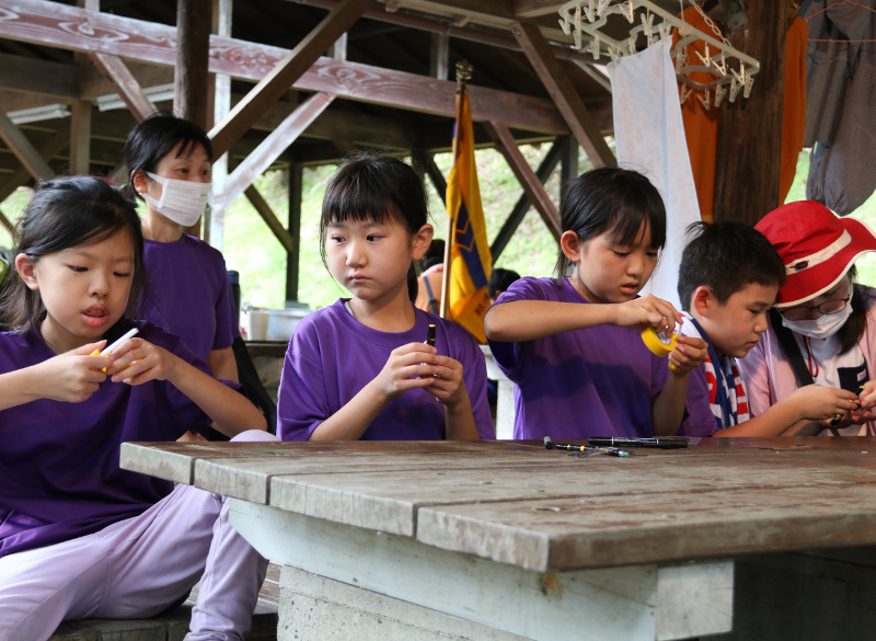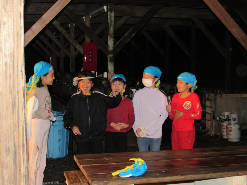 昼食(おにぎり)作り、伊予ケ岳登山。午後の工作では「オニ